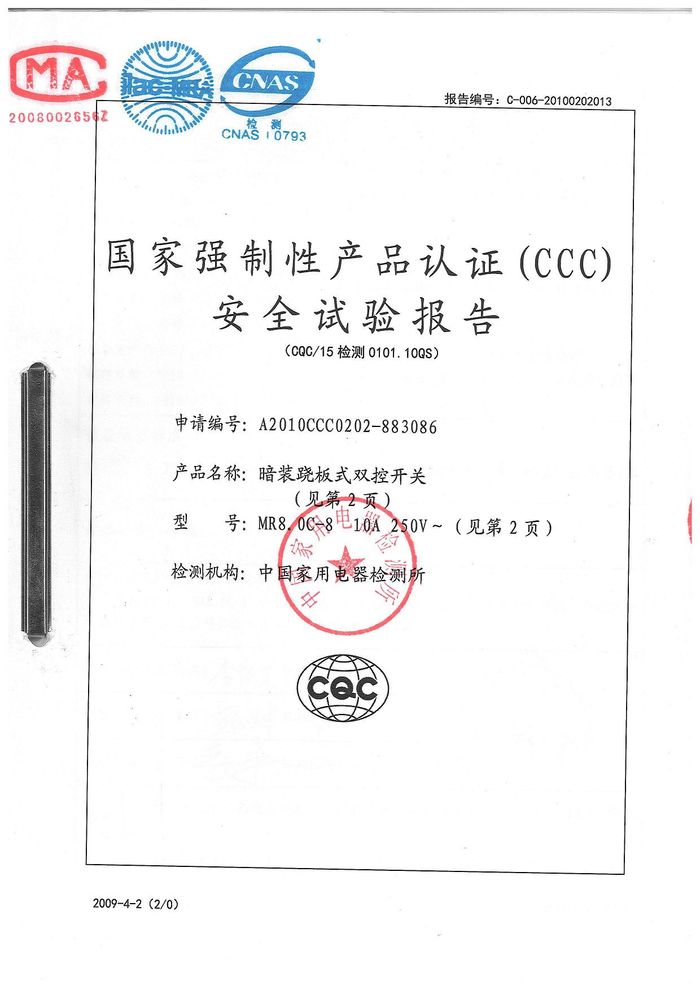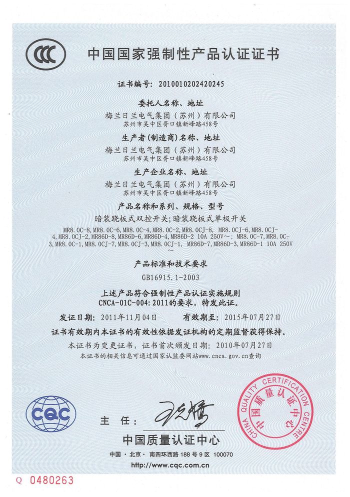 MR8.0C開關 86D插座資質(zhì)證書