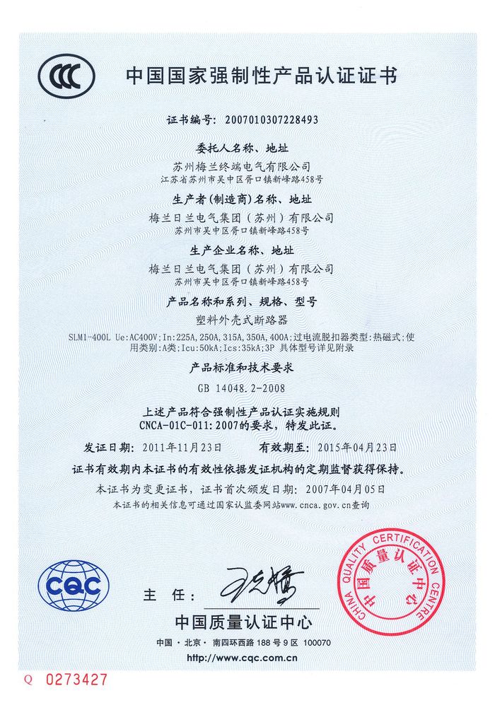 SLM1-400L塑殼斷路器資質(zhì)證書