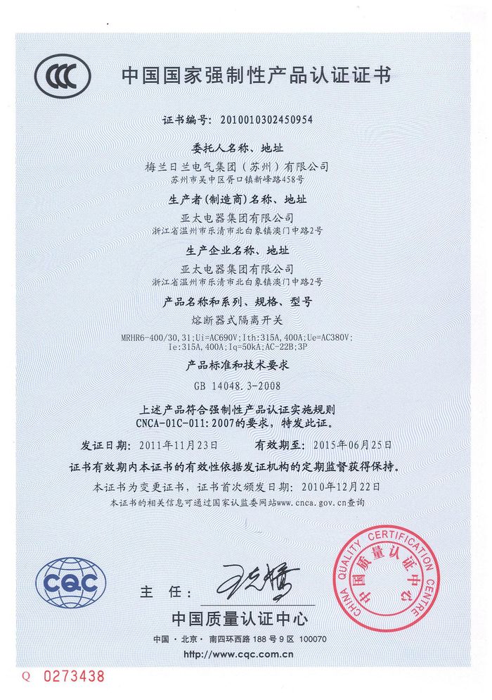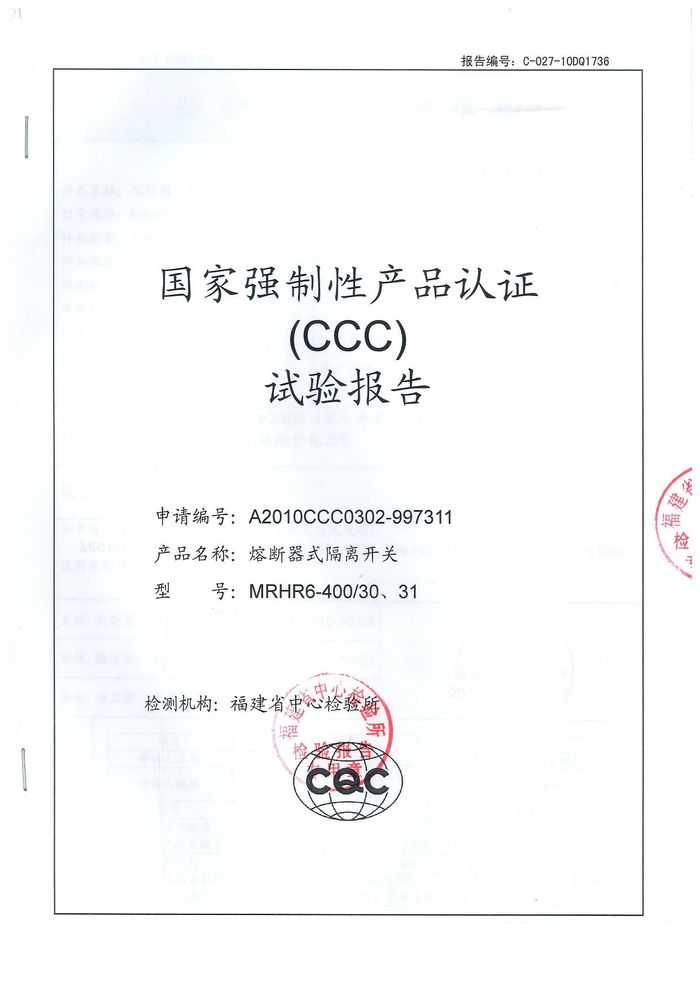 MRHRR-400熔斷隔離開關資質證書