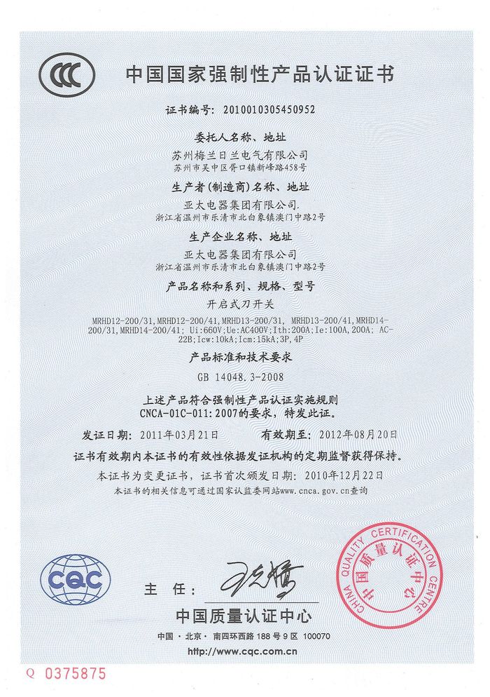 MRHD刀開關(guān)資質(zhì)證書