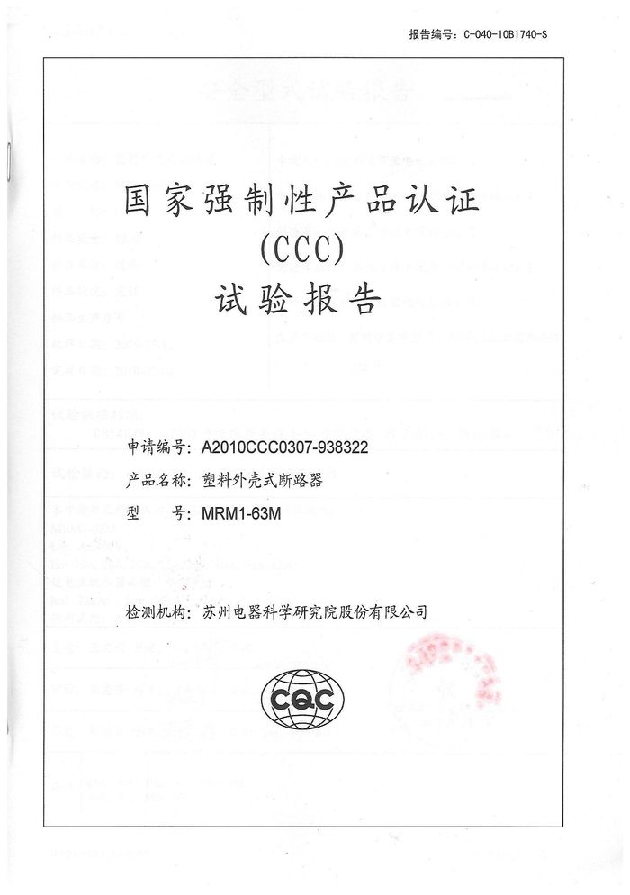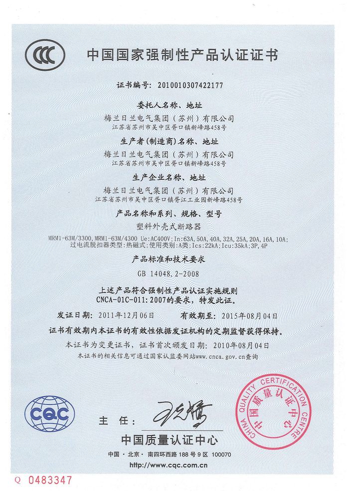 MRM1-63M塑殼斷路器資質(zhì)證書(shū)