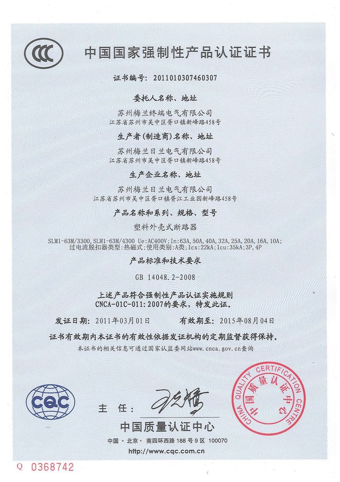 SLM1-63M塑殼斷路器資質(zhì)證書(shū)