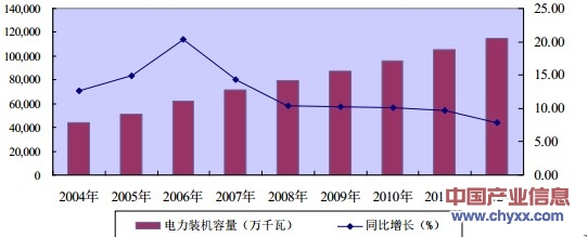 2004-2012年中國發(fā)電總裝機容量連續(xù)快速增長,“十一五”期間年均新增裝機容量近8,500萬千瓦,遠(yuǎn)高于“十五”期間約4,600萬千瓦的年均新增容量。2012年發(fā)電總裝機容量達(dá)到11.45億千瓦,2015年,國內(nèi)發(fā)電機裝機容量將達(dá)到14.37億千瓦左右,將超過美國而躍居世界第一。