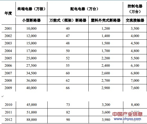 根據(jù)中國電器工業(yè)協(xié)會的統(tǒng)計,2001 年至 2012 年主要低壓電器產(chǎn)品的產(chǎn)銷量呈逐年上升趨勢,低壓電器產(chǎn)品保持較快速度增長,終端電器、配電電器、控制電器產(chǎn)量復(fù)合增長率分別為 21.86%、11.41%、10.50%,今后較長一段時間內(nèi)我國低壓電器市場容量仍會穩(wěn)步增長。