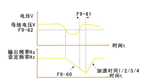 此功能指在瞬時停電時變頻器不會停機,在瞬間停電或電壓突然降低的情況下,變頻器降低輸出速度,通過負載回饋能量,補償電壓的降低,以維持變頻器短時間內(nèi)繼續(xù)運行。