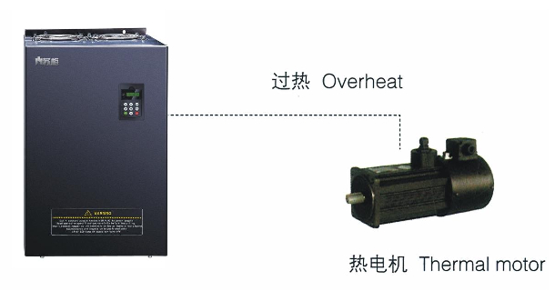 選用輸入輸出擴展卡,模擬量輸入A13可接受電機溫度傳感器輸入(PTlOO,PTlOOO)。當電機溫度越過預(yù)警值時,變頻器輸出脈沖信號提示過熱,當電機溫度超過過熱保護值時,變頻器故障輸出給電機妥善的保護。